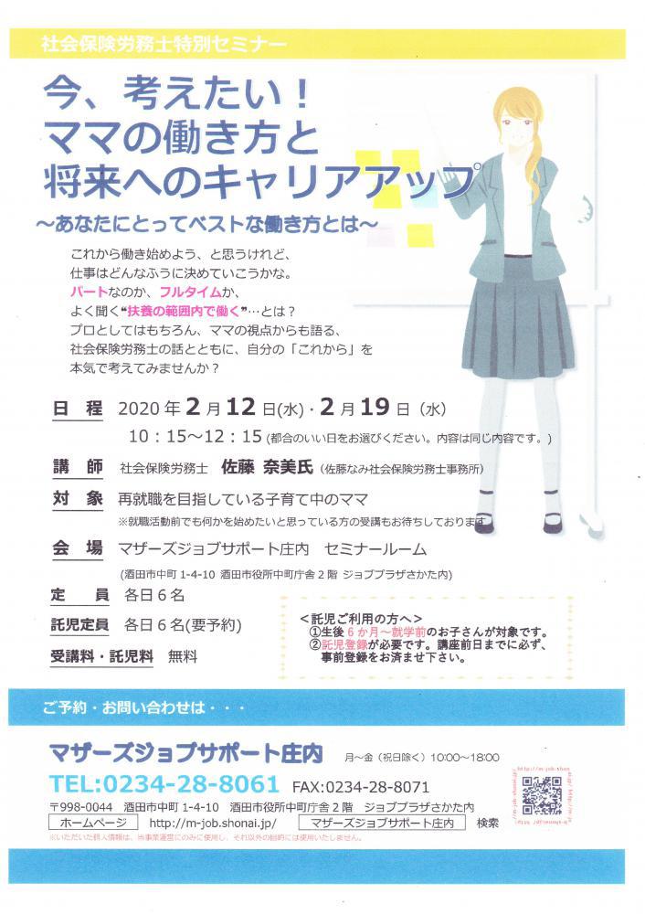 ☆今、考えたい!ママの働き方と将来へのキャリアアップ☆〜あなたにとってベストな働き方とは〜「自分にはどんな働き方があっているのかな?」「よく聞く"扶養の範囲内で"働くって…?」プロとしてはもちろんママの視点からも語る社会保険労務士の話とともに自分の『これから』について考えてみませんか? 【日 時】2月12日(水)または2月19日(水) 10時15分〜12時15分※都合のいい日をお選びください。内容は同じ内容です。 【対 象】就職を目指している子育て中のママ※就職活動前でも何かを始めたいと思っているママもOK 【会 場】 マザーズジョブサポート庄内 セミナールーム【受講料・託児料】 無料【定 員】 各日先着6名【託児定員】 各日最大6名 ※事前にご登録と利用予約が必要です。【駐車場について】お車でお越しの際は、中町庁舎脇にある〈セントラルホテル契約駐車場〉をご利用ください。(ジョブプラザさかたと表示してあります。)※契約駐車場が満車の場合は、酒田市中央地下駐車場をご利用ください。酒田市中央地下駐車場をご利用の方は、無料駐車券(最大2時間)を発行いたします。お帰りの際に、コンシェルジュ窓口へお声がけください。 ◇お申込み・お問い合わせ◇マザーズジョブサポート庄内TEL:0234-28-8061