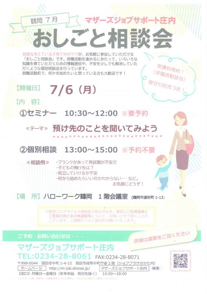 ●7月 マザーズおしごと相談会in鶴岡 開催のお知らせ