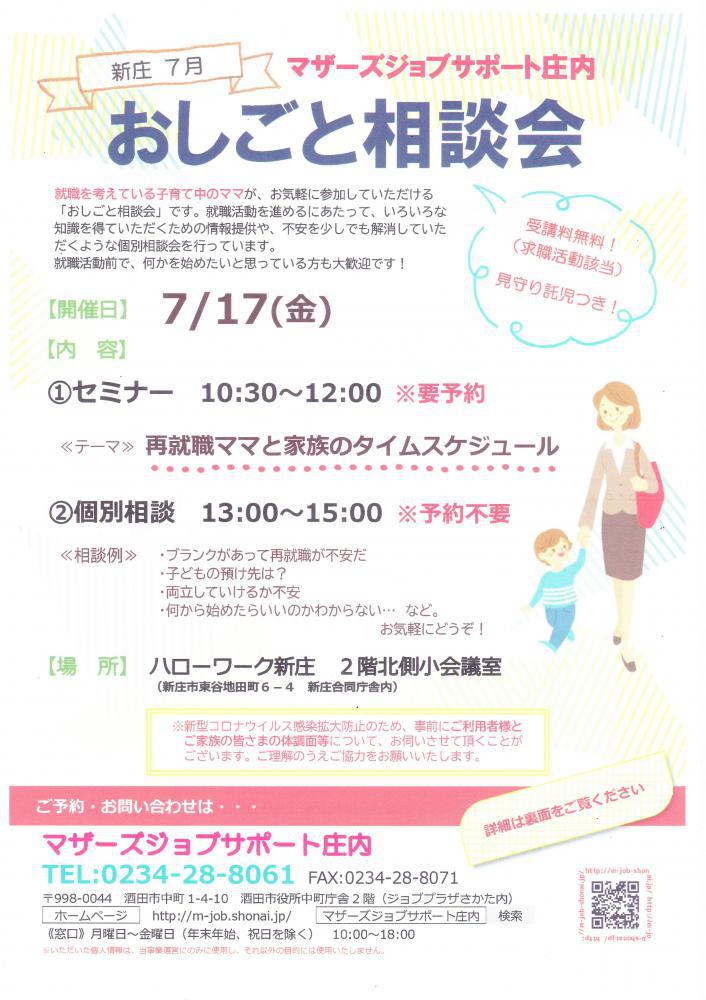 ハローワーク新庄『おしごと相談会』を開催します。 【日時と内容】■ 7月17日(金)10:30〜12:00 セミナー ※お申込みが必要です。「再就職ママと家族のタイムスケジュール」自分や家族の一日をタイムスケジュール表に書き出して、生活を見直してみましょう。働き始めると、今の生活がどんなふうに変わっていくのかイメージしながら、仕事復帰のヒントを一緒に考えてみませんか? 13:00〜15:00 個別相談会※どなたでもご利用いただけますお申込みは不要です。・おしごとに関するお悩み・子育てに関すること・仕事と家事、子育てとの両立 など、お気軽にご相談ください。 ♪お子さんと一緒に、お気軽にお越しください♪お子さんと同じお部屋でセミナーを受講し、相談することができます。保育スタッフが、お子さんを見守ります。 ★★受講者の皆様へお願い★★新型コロナウイルス拡大防止のため、・入室時の検温・手指の消毒・会場でのマスク着用・距離をとっての対応・定期的な換気にご協力お願いいたします。★★ーーーーーーーーーーーー★★ ◇お申込み・お問合せ◇マザーズジョブサポート庄内TEL:0234-28-8061