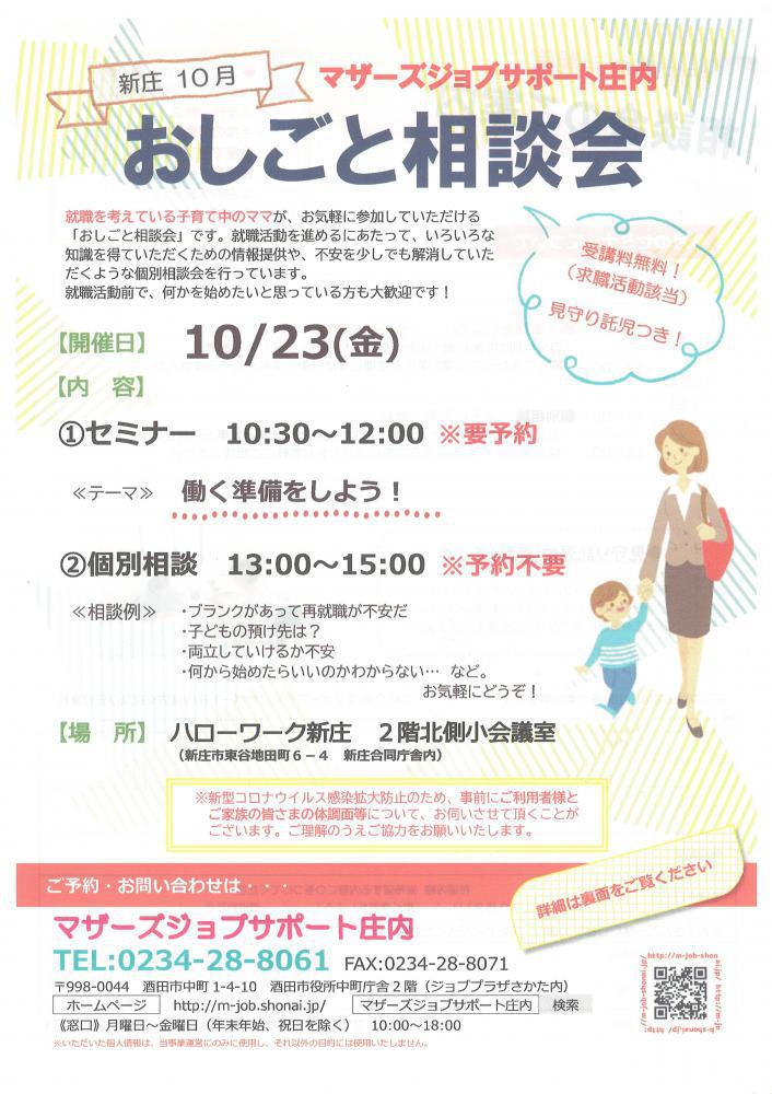 ハローワーク新庄『おしごと相談会』を開催します。 【日時と内容】■ 10月23日(金)10:30〜12:00 セミナー ※お申込みが必要です。「働く準備をしよう!」いざ就職活動を始めるとなると、何から始めたらよいのかわからない・・・そんなママのために、働く目的を確認し、就活の基本を学んでいきます。        13:00〜15:00 個別相談会※どなたでもご利用いただけますお申込みは不要です。・おしごとに関するお悩み・子育てに関すること・仕事と家事、子育てとの両立      など、お気軽にご相談ください。  ♪お子さんと一緒に、お気軽にお越しください♪お子さんと同じお部屋でセミナーを受講し、相談することができます。保育スタッフが、お子さんを見守ります。 ★★受講者の皆様へお願い★★新型コロナウイルス拡大防止のため、・入室時の検温・手指の消毒・会場でのマスク着用・距離をとっての対応・定期的な換気にご協力お願いいたします。★★ーーーーーーーーーーーー★★ ◇お申込み・お問合せ◇マザーズジョブサポート庄内TEL:0234-28-8061