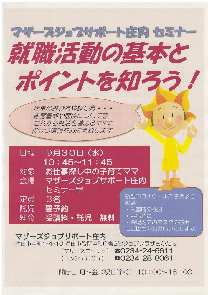 9月『マザーズジョブサポート庄内求職支援セミナー』『就職活動の基本とポイントを知ろう!』を行います! 就職活動を始めるための基本とポイントを学んでみませんか?★仕事の選び方や探し方★応募書類や面接について など 就活を進めるママに役立つ情報をお伝えします。 ハローワークマザーズコーナーでは定期的にセミナーを開催します。奮ってご参加下さい。受講後も疑問点など、窓口にてご相談が受けられます。☆雇用保険受給者の方は求職活動実績にカウント出来ます☆ 【日 時】9月30日(水)10時45分〜11時45分【対 象】お仕事探し中の子育てママさん【会 場】マザーズジョブサポート庄内セミナールーム【料 金】受講料 及び 託児料 無料【定 員】先着3名※お申込みが必要です。【託 児】定員3名※事前登録・予約が必要です。※併設の保育ルームで、保育スタッフがお子さんをお預かりします。ママは安心して受講いただけます。                【駐車場について】お車でお越しの際は、中町庁舎脇にある〈セントラルホテル契約駐車場〉をご利用ください。(ジョブプラザさかたと表示してあります。)※契約駐車場が満車の場合は、酒田市中央地下駐車場をご利用ください。無料駐車券(最大2時間)を発行いたします。お帰りの際に、マザーズ窓口へお声がけください。 どうぞ、お気軽にお問合せくださいね。 ◇お申込み・お問い合わせ◇マザーズジョブサポート庄内<ハローワークマザーズコーナー>TEL:0234-24-6611<コンシェルジュコーナー>TEL:0234-28-8061開庁日 月〜金(祝日除く)10:00〜18:00