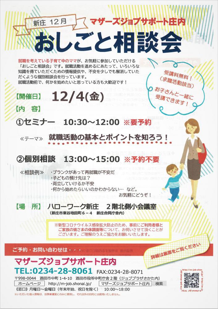 ハローワーク新庄『おしごと相談会』を開催します。 【日時と内容】■ 12月4日(金)10:30〜12:00 セミナー ※お申込みが必要です。「就職活動の基本とポイント」ハローワークの職員を講師に招いてのセミナーです。求人票を見る時のポイントや書類の書き方、面接の受け方など、具体的な話を聞いて、仕事復帰のヒントを一緒に見つけてみませんか?                13:00〜15:00 個別相談会※どなたでもご利用いただけますお申込みは不要です。・おしごとに関するお悩み・子育てに関すること・仕事と家事、子育てとの両立      など、お気軽にご相談ください。  ♪お子さんと一緒に、お気軽にお越しください♪お子さんと同じお部屋でセミナーを受講し、相談することができます。保育スタッフが、お子さんを見守ります。 ★★受講者の皆様へお願い★★新型コロナウイルス拡大防止のため、・入室時の検温・手指の消毒・会場でのマスク着用・距離をとっての対応・定期的な換気にご協力お願いいたします。★★ーーーーーーーーーーーー★★ お問い合わせはマザーズジョブサポート庄内TEL:0234-28-8061