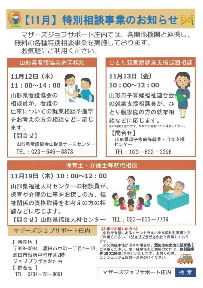マザーズジョブサポート庄内では、各関係機関と連携し、各種特別相談事業を実施しております。ぜひ、ご利用ください。 山形県看護協会巡回相談 ※お申し込み不要日 時 11月12日(木)11:00〜14:00場 所 マザーズジョブサポート庄内 セミナールーム問合せ 山形県看護協会 пF023-646-8878HP:http://www.nurse-yamagata.or.jp/ 看護の仕事への復職をお考えの方、お気軽にご相談ください。 保育士・介護士等就職相談※お申し込み不要日 時 11月19日(木)10:00〜12:00場 所 マザーズジョブサポート庄内 セミナールーム問合せ 山形県福祉人材センター пF023-633-7739HP:http://www.ymgt-shakyo.or.jp/jinzai/保育士・介護士・看護師など資格をお持ちの方や、資格取得を目指している方、福祉職にご関心のある方は、お気軽にお越しください。 ひとり親家庭就業支援相談 [要予約]日 時 11月13日(金)10:00〜12:00場 所 マザーズジョブサポート庄内 セミナールーム問合せ 山形県母子家庭等就業 ・自立支援センター пF023-632-2296HP:http://www.y-boshi.com/self-support/ひとり親家庭の方や今後について考えている方、どうぞお気軽にお越しください。 ※各相談会について、利用ご希望の方は、マザーズジョブサポート庄内までお気軽にお声掛けください。※ご相談の際、お子さまの託児は『保育ルーム きらきら』をご利用いただけます。託児ルームのご利用には、事前のご登録が必要です。 【駐車場について】お車でお越しの際は、中町庁舎脇にある〈セントラルホテル契約駐車場〉をご利用ください。(ジョブプラザさかたと表示してあります。)※契約駐車場が満車の場合は、酒田市中央地下駐車場をご利用ください。無料駐車券(最大2時間)を発行いたします。お帰りの際に、コンシェルジュ窓口へお声がけください。 ◇お申込み・お問い合わせ◇マザーズジョブサポート庄内TEL:0234-28-8061