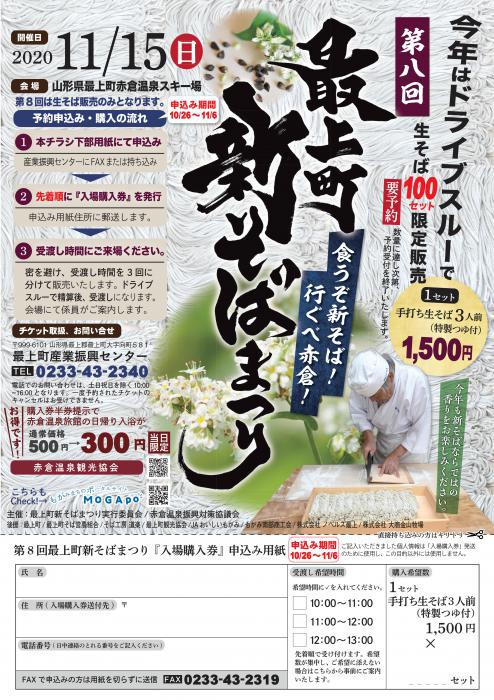 今年はドライブスルーで!! 第八回 最上町新そばまつり〜今年も新そばならではの香りをお楽しみください。〜【開催日】11月15日(日)【会 場】山形県最上町赤倉温泉スキー場 ★予約申込は10月26日から!!手打ち生そば 3人前(特製つゆ付)   1セット 1,500円  要予約 100セット限定販売 ★予約申込期間★10月26日(月)〜11月6日(金)数量に達し次第、予約受付を終了いたします。第8回は生そば販売のみとなります。     予約申込み・購入の流れ@チラシ下部用紙にて申込み最上町産業振興センターにFAXまたは持ち込み      ↓A先着順に『入場購入券』を発行申込み用紙住所に郵送します      ↓B11月15日、受渡し時間にご来場ください密を避け、受渡し時間を3回に分けて販売いたします。ドライブスルーで精算後、受渡しになります。会場にて係員がご案内します。 ★購入券半券提示で赤倉温泉旅館の日帰り入浴がお得に!赤倉温泉旅館加盟店での日帰り入浴が通常価格 500円⇒300円 当日限定!!申込の際はチラシを印刷してご利用ください。最上町新そばまつりチラシ.pdf ★チケット取扱・お問い合せ最上町産業振興センターTEL 0233-43-2340電話でのお問い合わせは、土日祝日を除く10:00〜16:00となります。一度予約されたチケットのキャンセルはお受けできません。 最上町の情報はもがぽで https://mogami-portal.net/