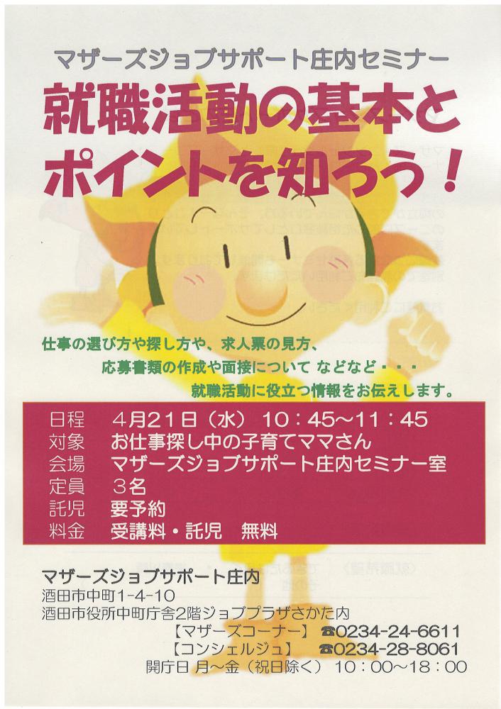 『マザーズジョブサポート庄内求職支援セミナー』『就職活動の基本とポイントを知ろう!』を行います! 就職活動を始めるための基本とポイントを学んでみませんか?★仕事の選び方や探し方★応募書類や面接について など 就活を進めるママに役立つ情報をお伝えします。 ハローワークマザーズコーナーでは定期的にセミナーを開催します。奮ってご参加下さい。受講後も疑問点など、窓口にてご相談が受けられます。☆雇用保険受給者の方は求職活動実績にカウント出来ます☆ 【日 時】4月21日(水)10時45分〜11時45分【対 象】お仕事探し中の子育てママさん【会 場】マザーズジョブサポート庄内セミナールーム【料 金】受講料 及び 託児料 無料【定 員】先着3名※お申込みが必要です。【託 児】定員3名※事前登録・予約が必要です。※併設の保育ルームで、保育スタッフがお子さんをお預かりします。ママは安心して受講いただけます。 【駐車場について】お車でお越しの際は、中町庁舎脇にある〈セントラルホテル契約駐車場〉をご利用ください。(ジョブプラザさかたと表示してあります。)※契約駐車場が満車の場合は、酒田市中央地下駐車場をご利用ください。無料駐車券(最大2時間)を発行いたします。お帰りの際に、マザーズ窓口へお声がけください。 どうぞ、お気軽にお問合せくださいね。 ◇お申込み・お問い合わせ◇マザーズジョブサポート庄内<ハローワークマザーズコーナー>TEL:0234-24-6611<コンシェルジュコーナー>TEL:0234-28-8061