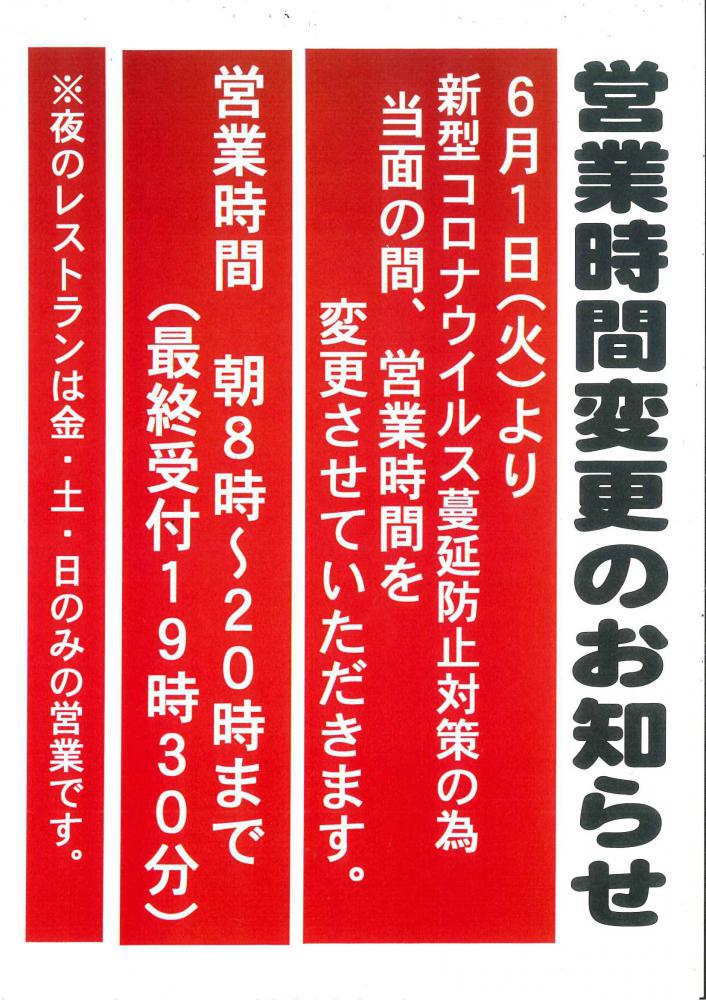 2021.6月1日(火)〜営業時間の変更のお知らせ新型コロナウイルス感染症蔓延防止対策のため、当面の間、営業時間を変更させて頂きます。営業時間 朝8時〜20時まで(最終受付19:30分)※夜のレストランは金・土・日のみ営業となります。ご了承下さいませ。