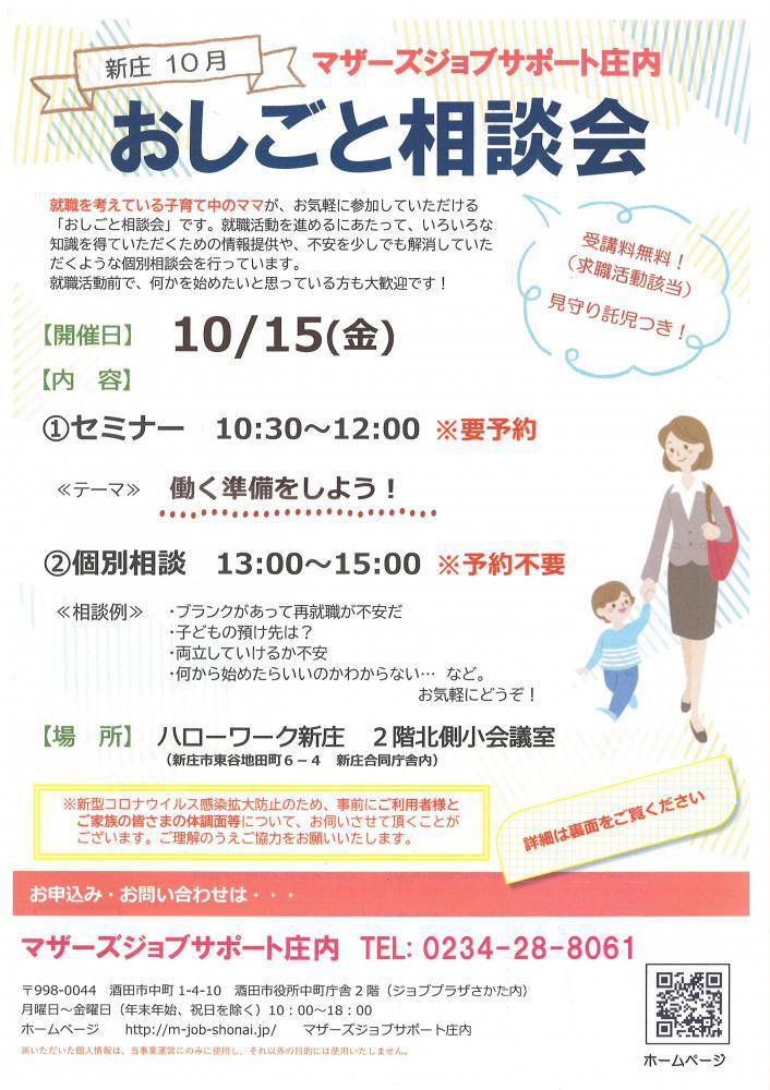 ハローワーク新庄『おしごと相談会』を開催します。 【日時と内容】■ 10月15日(金)10:30〜12:00 セミナー ※お申込みが必要です。「働く準備をしよう!」いざ就職活動を始めるとなると、何から始めたらよいのかわからない・・・そんなママのために、働く目的を確認し、就活の基本を学んでいきます。 13:00〜15:00 個別相談会※どなたでもご利用いただけますお申込みは不要です。・おしごとに関するお悩み・子育てに関すること・仕事と家事、子育てとの両立 など、お気軽にご相談ください。 ♪お子さんと一緒に、お気軽にお越しください♪お子さんと同じお部屋でセミナーを受講し、相談することができます。保育スタッフが、お子さんを見守ります。 ★★受講者の皆様へお願い★★新型コロナウイルス拡大防止のため、・入室時の検温・手指の消毒・会場でのマスク着用・距離をとっての対応・定期的な換気にご協力お願いいたします。新型コロナウイルス感染症の影響により、中止または延期となる場合がございます。あらかじめ、ご了承ください。★★ーーーーーーーーーーーーーーー★★ ◇お申込み・お問合せ◇マザーズジョブサポート庄内TEL:0234-28-8061メールでのお申込みはコチラ