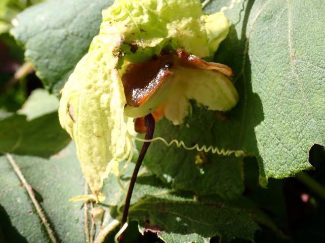 裂果が始まった。温室形成の多様性は気候変動と立地条件を予測して作られる。ミヤマニガウリの実の裂果最盛期だ。温室は浅黄(温室を作るー光合成と相反する?浅黄状態は葉が薄く透けて見えるー光を通す)、裂果ー2、青い実ー8