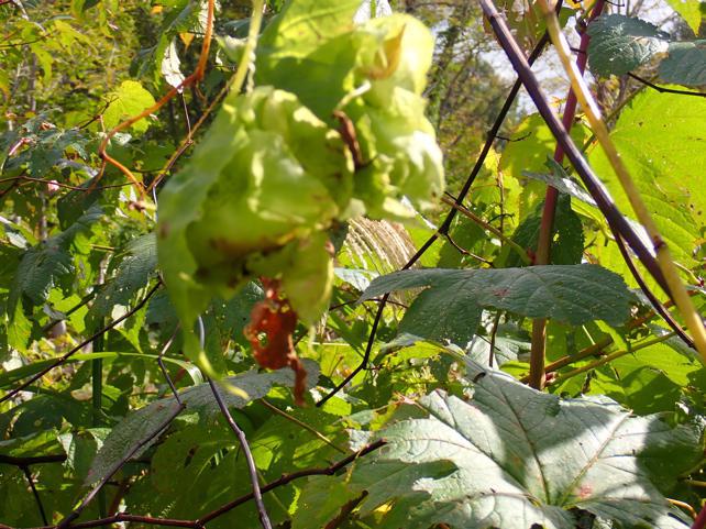 はじけそうな温室が残った。温室に守られもうすぐ裂果〜種子を地上に落として。