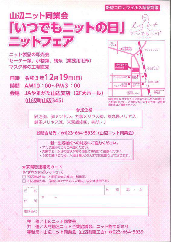 12月19日(日)は山辺ニット同業会による「いつでもニットの日」ニットフェアを行います。町内のニット製造業7社によるニット製品の工場直売会です。ニット製品のほかに小物類、残糸、マスク等も販売されます。全国有数のニットの産地でもある山辺町のニット製品をお得にお買い求め下さい。 「いつでもニットの日」ニットフェア日時:令和3年12月19日(日)時間:AM10:00〜PM3:00会場:JAやまがた山辺支店(2F大ホール)お問い合わせ先:山辺ニット同業会(山辺町商工会) 電話023−664−5939