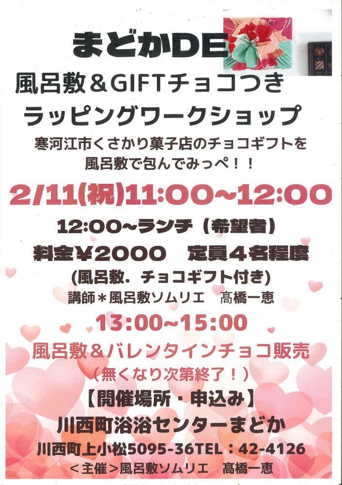 寒河江市くさかり菓子店のチョコギフトを風呂敷で包んでみませんか?12:00〜希望者ランチ金額:2,000円(風呂敷・チョコギフト付き)定員:4名場所:温泉棟ロビー講師:風呂敷ソムリエ:煖エ一恵申込み:浴浴センターまどかTEL:0238-42-4126まで※感染症対策しっかりして、少人数で開催いたします♪