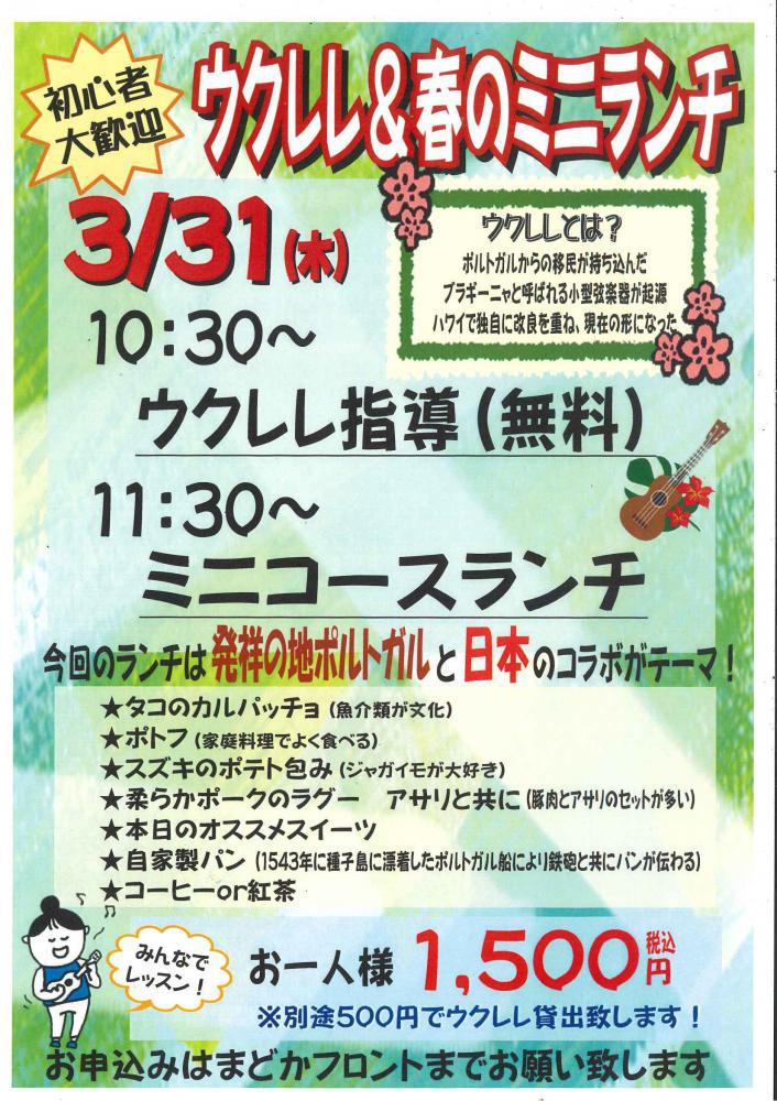 3月31日(木)ウクレレ&春のミニランチ開催!!日時:3月31日(木) 10:30〜場所:まどか会議室でウクレレレッスンその後11:30〜レストランでミニコースランチ※今回のランチはウクレレ発祥の地ポルトガルにちなんで ポルトガルと日本がテーマのランチとなっております。 みんなで楽しくレッスン後、まどかの美味しいランチはいかがですか?初心者大歓迎♪ ※500円でウクレレ貸出しも行っております