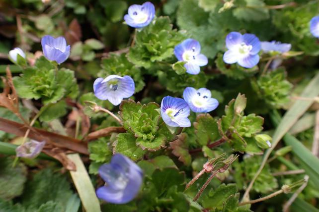 畔の中にはい入るように清純な花のイヌノフグリを見る。群生をなす。