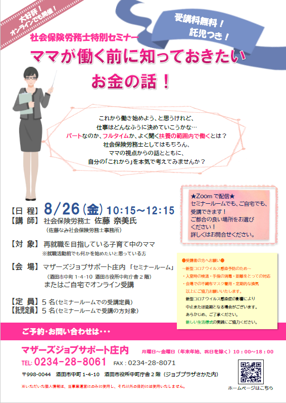 ☆ママが働く前に知っておきたいお金の話!☆ ☆☆セミナールームでの受講は     満員御礼☆☆ご自宅でオンラインでの受講は     随時募集中です!  「自分にはどんな働き方があっているのかな?」「よく聞く"扶養の範囲内で"働くって…?」プロとしてはもちろんママの視点からも語る社会保険労務士の話とともに自分の『これから』について考えてみませんか?  【日  時】8月26日(金) 10時15分〜12時15分 【対  象】就職を目指している子育て中のママ※就職活動前でも何かを始めたいと 思っているママもOK 【会  場】 マザーズジョブサポート庄内 セミナールーム酒田市中町1-4-10酒田市役所中町庁舎2階または ご自宅でオンライン受講(Zoom)【受講料・託児料】 無料【定  員】 @セミナールームでの受講のみ(定員5名)Aオンラインでの受講は随時受け付けております※@の場合は託児もご利用いただけます。【託児定員】 定員5名 ※事前にご登録と利用予約が必要です。【駐車場について】お車でお越しの際は、中町庁舎脇にある〈セントラルホテル契約駐車場〉をご利用ください。(ジョブプラザさかたと表示してあります。)※契約駐車場が満車の場合は、酒田市中央地下駐車場をご利用ください。無料駐車券(最大2時間)を発行いたします。お帰りの際に、コンシェルジュ窓口へお声がけください。 ★セミナールームご利用の皆様へお願い★〜新型コロナウイルス感染予防のため〜・入室時の検温・手指の消毒・距離をとっての対応・会場での不織布マスク着用・定期的な換気 以上にご協力お願いいたします。 新型コロナウイルス感染症の影響により 中止または延期となる場合がございます。 あらかじめ、ご了承ください。 新しい生活様式の実践にご協力ください。★★ーーーーーーーーーーーーーーーー★★●ご自宅でオンライン受講ご利用の方へ●・インターネット環境が必要になります。 通信料は自己負担です。・パソコン、スマートフォン、 またはたタブレットをご準備いただき、 事前にZoom meetingを ダウンロードしてください。・セミナー中はカメラをオンにし、 お顔の見える状態で受講して下さい。●●ーーーーーーーーーーーーーーーー●● ◇お申込み・お問い合わせ◇マザーズジョブサポート庄内TEL:0234-28-8061メールでのお申込みはコチラ