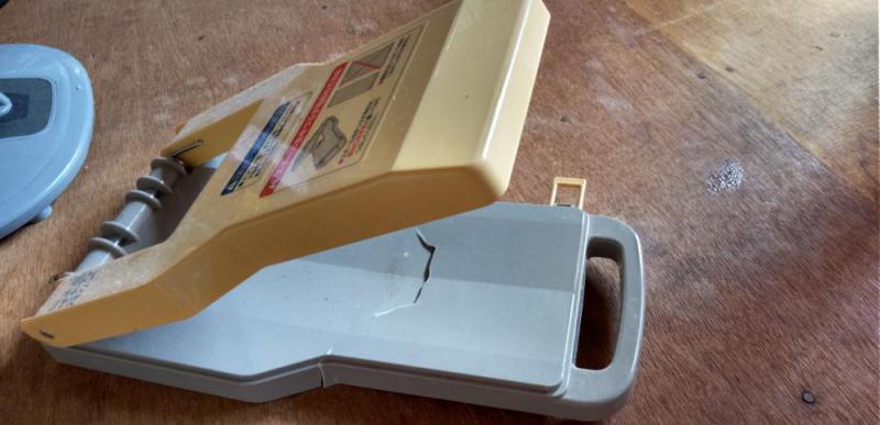 空き缶つぶし器がこわれました。こうなると、つぶれにくくなります。3台目です。21年4月11日購入なので、1年5ヶ月です。大体1年ちょっとでこわれます。これだけ使ったのでOK!と言うべきか、またかよ!と言うべきか?ムサシで購入したけど、アマゾンでも売っています。処分は、町の青い袋に入れて出します。