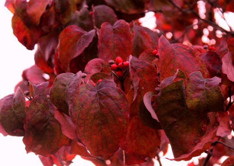 ●ハナミズキの葉も実も真っ赤に色づいてきました まもなく落葉しすっかり葉っぱはなくなります そばに来年さく花芽がついています一冬を越してまたピンクの花を見せてくれます これから半年じっと冬を耐えて新しい芽、花をみせてくれるのです