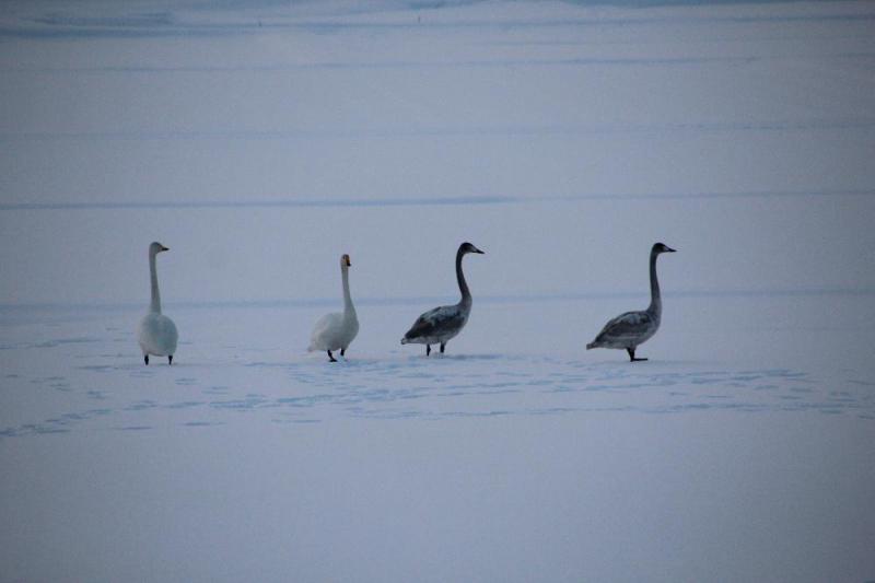 ●雪原での白鳥のダンス 餌もないのに田んぼの中に白鳥がじっと寒さをたえているかのように座っていました そんな中で4羽の白鳥が首を振ったり羽を広げたりとダンスをしているかのようでした 寒さはこれからです 頑張れと応援したくなります