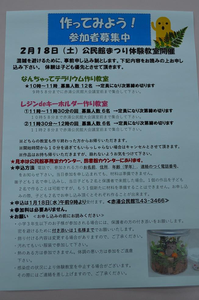 2月18日(土)赤湯公民館まつりにて体験教室を開催します。赤湯地区の皆様には1/16公民館だより、全戸配布チラシでご案内させて頂きました。なんちゃってテラリウム作り教室レジンdeキーホルダー作り教室中学生企画パンパンクラッカー作り教室参加は無料です。混雑を避けるため事前申し込みが必要です。赤湯公民館 0238-43-3466