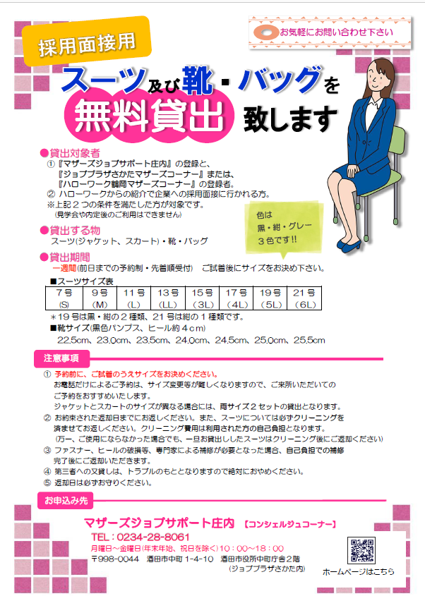 いつも、マザーズジョブサポート庄内をご利用いただきありがとうございます。【コンシェルジュコーナー】では就職面接用のスーツ、靴、バッグの無料貸出しを行っております。貸出し期間は1週間※マザーズジョブサポート庄内の ・マザーズコーナー ・コンシェルジュコーナーともに ご登録がお済みの方で、 ハローワークからのご紹介で 面接に行かれる方に限ります。安心の定番3色黒・紺・グレーサイズも豊富に取り揃えております!スーツのサイズ 7号〜21号靴のサイズ 22.5cm〜25.5cmバッグ A4書類対応サイズ ご興味のある方はどうぞ、お気軽にお問い合わせください。あなたの就活、応援します! マザーズジョブサポート庄内0234-28-8061