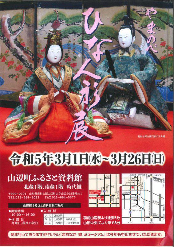 3月1日(水)〜26日(日)まで、ふるさと資料館で「やまのべひな人形展」を開催します。最上川舟運により運ばれてきた貴重な雛人形を展示公開します。寛永から明治の時代雛をお雛様がつくられた時代の飾り方で小道具一つ一つにこだわりながら展示します。一年にいっぺんのお雛様との出逢いをお楽しみください。 日 時:令和5年3月1日(水)〜3月26日(日) 10:00〜16:00 ※月曜日・祝日は休館日場 所:ふるさと資料館入館料:大人200円、学生(高校生以上)100円、小人(小中児童生徒)50円お問い合わせ先:ふるさと資料館 TEL023−664−5033