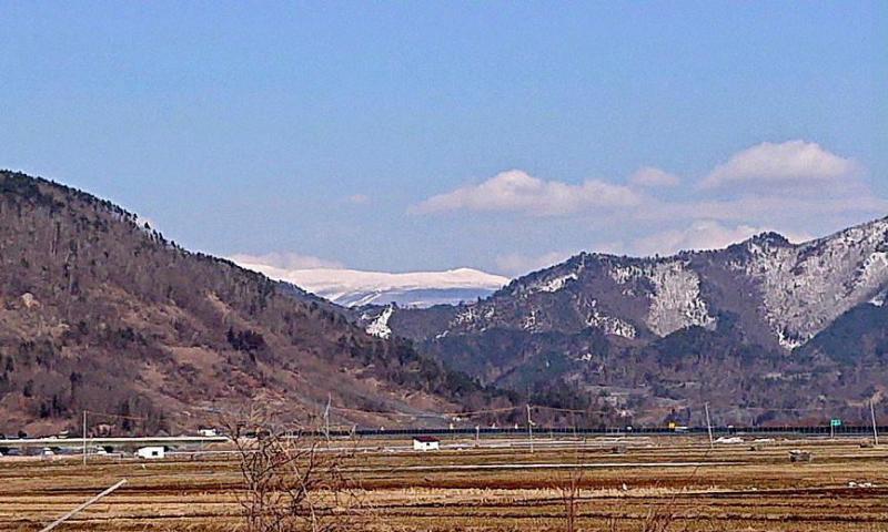 ●暖かな日が続きます 遠く蔵王が見え 薄っすらとスキーのコースらしきものも見えます 早春の風景の一コマです 田んぼにはまもなく北に帰る白鳥が餌をついばんでいます