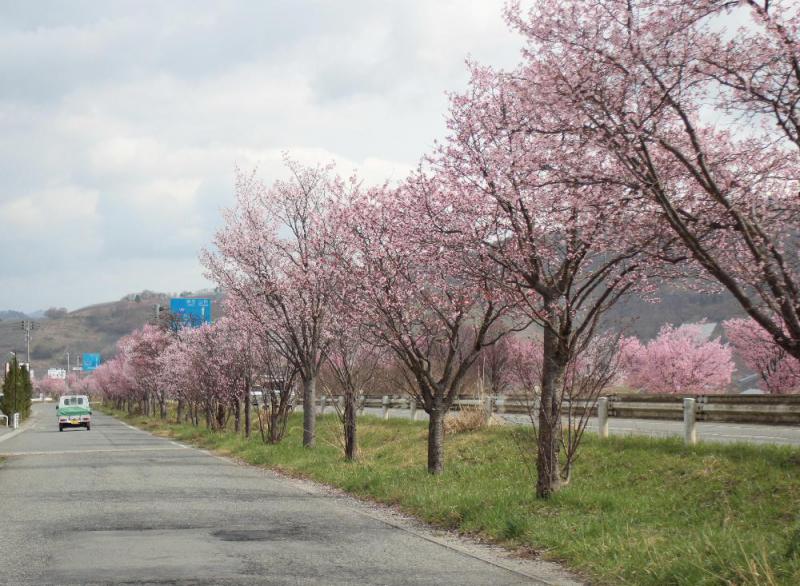 ●昨日の雪にはびっくりしましたが今日は晴れて暖かくなりそうです 赤湯の隠れた桜の名所(?)は国道13号線バイパスの側道に植えられている数百本の桜です ここの桜の特徴は一本一本違う種類の桜が植栽されており様々なピンクの花が咲いてことです ちょうど今が見ごろで私の散歩コースでもあり春の風を受けて気持ち良く歩いています あまり歩いている人もなく国道では次々と車が走り抜けていきます