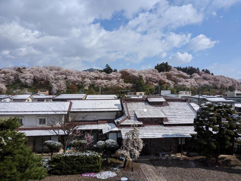 朝、窓の外を見ると、春の装いだった地面がうっすらと白くなっていました。冬の忘れ物のように雪もちらついていた朝。今は雪は降っていませんが、空は曇っています。気温は低く、溶けた雪で足元は悪くなっています。どうぞお越しの際は、温かい格好でいらっしゃってください。赤湯温泉桜まつりは4月8日から4月30日まで開催され、期間中は18時から22時までライトアップも行われています。詳しくはhttp://www.city.nanyo.yamagata.jp/kankoibento/241をご参考ください。※記念館の開館時間は午前9時〜16時30分(入館受付は16時まで)入館無料・月曜休館 お問い合わせは 電話0238−43−6802まで