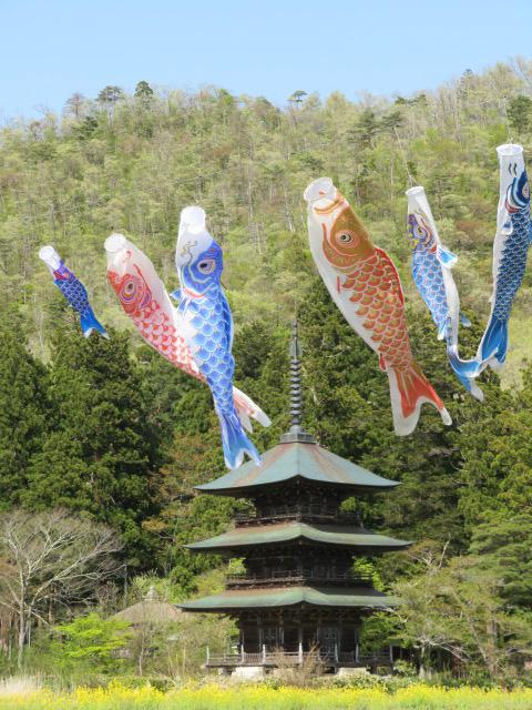 三重塔前に、今年もたくさんの"こいのぼり"が泳ぎ始めました♪こいのぼり、菜の花、三重塔のコラボレーションが見られるのは、期間限定、まさに今だけです!!爽やかな風景を、ぜひ見に来て下さいね〜♪※こいのぼりは5月6日迄です。