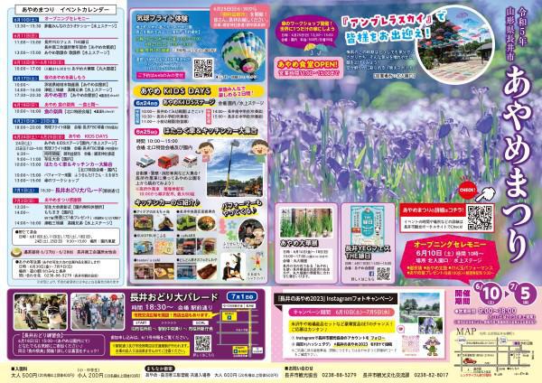 あやめまつりまつり期間/6月10日(土)〜7月5日(日)  9:00~18:00      6月17日(土)は20:30まで営業 オープニングセレモニー6月10日(土) 10:00~  北入園口/水上ステージ御祈祷・あやめ太鼓・けん玉パフォーマンス・あやめ苗プレゼント(先着100名)※整理券配布 9:30~ あやめ食堂OPEN! 営業時間11:00~15:00まで 「長井のあやめ2023」Instagramフォトキャンペーンキャンペーン期間 6月10日(土)〜7月5日(水)米沢牛や地場産品セットなど豪華賞品GETのチャンス!ご応募カンタン♪ Instagramで長井市観光協会のアカウントをフォロー   2 指定#(ハッシュタグ)  #長井のあやめ2023 を付けて投稿※ご応募に係る留意事項、詳細につきましてはこちらでご確認下さい 【まつり期間 イベント】6月10日(土)  10:00~    オープニングセレモニー【北入園口/水上ステージ】13:30~15:30 夢蔵みんなのカラオケショー【水上ステージ】 6月11日(日)11:00~15:00 長井YEGフェス THE縁日  長井商工会議所青年部会【あやめ会館前】13:00~15:00 あやめ歌謡会 歌謡祭【水上ステージ】 6月16日(金)〜6月18日(日)10:00~17:00 あやめ大華展【丸大扇屋】(入館は16:30まで) 長井の市の花である「あやめ」を使い長井華道会四流派の先生方が、丸大扇屋の雰囲気に合わせた華をいけます。 6月17日(土)  夜のあやめを楽しもう10:00~  ~姉妹都市盟約締結40周年記念~「茨城県結城市物産展」 【あやめ会館前】 売り切れ次第終了。お早めにお越しください。 14:00~16:00 津軽三味線 高橋兄弟【水上ステージ】17:30~20:30 あやめ夜市【あやめ会館前】 長井のうまいもの屋台〈お買物ラリー開催!3店舗で購入された方に抽選にて豪華賞品ゲットのチャンス!〉※20:00頃 抽選(予定) 19:00〜 mojoジャズLIVE キッズエンジョイ企画    17:30~20:00 射的ゲーム『1回(3発)100円』   17:30~19:30 ワークショップ(光るうちわ)『100円/先着50名』 6月18日(日)  あやめ 食の祭典〜食と舞〜10:00~16:00 食の祭典【北口特設会場】 ご来場特典♪ 大盤振舞!総額10万円分の会場内で利用できるお買い物券がガラポン抽選で500名様に当たる!(お1人様1回) 出店店舗 煖エ鯉屋・水上屋・菅製麩所・須藤米店・アイデアのおもちゃ箱・アジアンGOHAN with CONCEPT・草岡ハム加工組合・じんぐう寺農園・長沼酒造・cafe&lunch 山の下・はぎ苑・いいわけサンド・ガルバンゾー・りんご苑・春まちカフェ 長井の伝統神事 黒獅子舞(總宮獅子舞保存会)〈1回目〉11:00~〈2回目〉13:00〜 園内 けん玉パフォーマンス  ダンスパフォーマンス 長井おどり練習会 15:00~ ※雨天中止7月1日(土)に開催の「長井おどり大パレード」に向け、あやめ公園にて練習会を行います!とび入り参加OK!団体・個人問わず、どなたでもお気軽にご参加ください。 6月21日(水)・23日(金)・25日(日)  気球フライト体験   地上約20mの高さからあやめ公園周辺を眺めてみよう【有料/予約優先】会場/長井TBC球場実施日時/ 6月21日(水)・23日(金) 18:00〜20:00      6月25日(日) 7:00〜9:00      ※天候等により、中止の場合有り運営/YAMAGATA EXPERIENCE(いいでカヌークラブ) TEL050-5832-7512予約はwebのみの受付   ご予約・詳細はコチラから 6月24日(土)・25日(日)  あやめ KIDS DAYS24日(土)  あやめKIDSステージ 【園内/水上ステージ】 10:00~ 長井めぐみ幼稚園(よさこい)・10:30~ 長井小学校(吹奏楽)・11:00~ 小桜幼稚園(鼓笛隊)14:00~ 長井南中学校(吹奏楽)・15:00~ 長井北中学校(吹奏楽) 25日(日)7:00~9:00 気球フライト体験 【長井TBC球場】(予約優先)      同時開催 御利益朝市【總宮神社駐車場】9:00~11:00  あやめ写生大会 10:00~15:00 はたらく車&キッチンカー大集合【北口特設会場/園内】 自衛隊・警察・消防車両など大集合!高所作業車に乗ってあやめ公園を上から眺めてみよう。 ※高所作業車 整理券配布  10:00から順次配布 最大80組 キッチンカー アイデアのおもちゃ箱・長井中央商店街振興会・SUKOFRUすこふる・cafeARB・tantan's cafe・どんどん焼きカフェかしわや10:00~15:00 パフォーマー来園  〈ふうせんたけさん(バルーンパフォーマンス)・えるぼろ(ジャグリング)〉13:00~15:00 傘のワークショップ  会場:園内  料金:500円/50組限定 7月1日(土) 18:30~ 長井おどり大パレード【駅前通り】 7月2日(日)  あやめまつり感謝祭13:30~  写生大会表彰式【園内無料休憩所】14:00~  もちまき【園内】 (終了後)抽選にて「傘プレゼント」※数量限定・なくなり次第終了14:00~16:00  津軽三味線 高橋兄弟【水上ステージ】 ◯あやめ写生展(あやめ写生大会の出店作品を展示します) 日:6月30日(金)〜7月9日(日) 場所:道の駅川のみなと長井 問い合わせ先:0238-88-5279(長井市観光協会)◯湯茶接待  6月27日(火)・6月28日(水) 長井商工会議所女性会◯野だて茶会 日時:6月10日(土)・11日(日)・17日(土)・18日(日)・24日(土)・25日(日) 9:30~15:00 場所:園内 関連イベント・。*・。*・。*・。*・。*・。*・。*・。*・。*・◯米沢牛チャンピオン牛の郷 第13回長井黒べこまつり 日時:6月17日(土) 12:00~14:00  場所:長井こいで河川公園(小出舟場跡広場) 問合せ先:長井黒べこまつり実行委員会事務局(長井市農林課) 0238-82-8015◯花公園・キャンプ場・宿泊施設・日帰り温泉の
