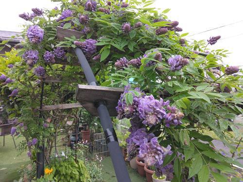 雨上がりの庭、緑が濃くなってきました。我が庭のバラの咲く順序は大体頭に入っていたはずなのに・・・、今年はどうしたことか一斉に咲き始める予感がします。そんなことになったら大変ですね。オープンガーデンも短期間に終わってしまい楽しみも無くなってしまいますね。 《トップページ》きょうは“アメジストフォール”アメリカフジです。今年はどうしたことか沢山の房がアーチを覆って見応え十分です。 拡大すると、、、どうですか? バラ庭は。。。 16日にアップした早咲きの"コーネリア“2本植えなのでいつもの年よりも豪華にみえます。 ↓一重咲きの“デンティベス”咲き始めのピンクの色が素敵ですね。 ↓“クードゥクール”二重で可愛い花です。 ↓少しずつ色づいてきた“花炎"変化が楽しめるクレマチスです。 ↓"花炎"と似ている“レッドスター” 今年のクレマチスは、みんな元気で大輪に咲いてくれて見ごたえあります〜♪ 我が庭は、クレマチスとバラをコラボさせているので本数は相当数あり今の時期は両方の競演が見られます。