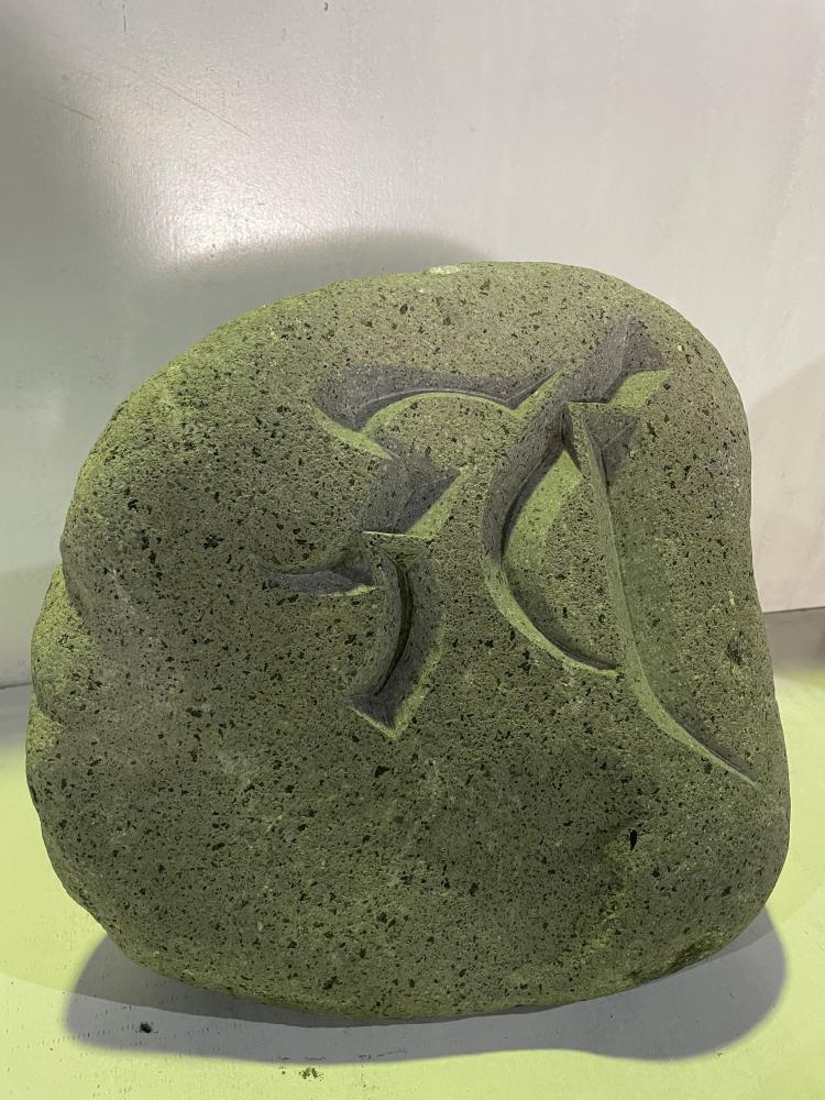 玉石に梵字を薬研彫りで彫刻しました。梵字とは、古代インド語を表す文字のことで、梵語(サンスクリット語)を書き表す際に用いた文字です。日本には、仏教の経典を書くのに使われた悉曇文字(しったんもじ)として、仏教の伝播にともなって伝えられたそうです。(資料からの引用です)また、薬研彫りとは文字を彫刻する際に用いる技法の一つで彫り込んだ文字をV字にすることにより立体感を際立たせ、彫り込んであるのに浮き上がっているように見せる技法のことをいいます。私、まだまだ未熟者ではありますが少しは浮き上がっているように見えますか??作者の主観というものは意外と曖昧なものなのかなと、自分の作品を冷静に、客観的に評価できる職人・作家でありたいと常々感じているところであります。