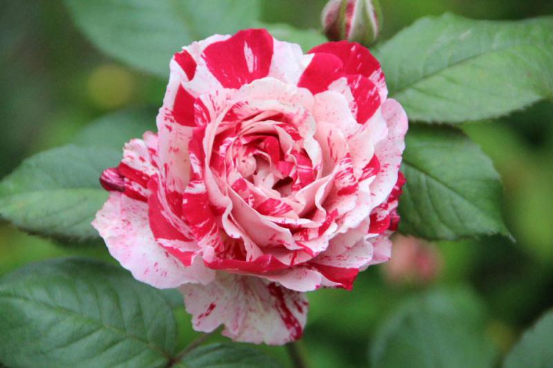 ●我が家の5つ目のバラは赤と白の絞り模様の変わった花で「センチメンタル」と名前のついた中輪の四季咲きのバラです あまり強くはありませんが甘い香りがします 強くて育てやすいと説明書きにありましたが土があまりよくないせいか8輪しか咲いていません