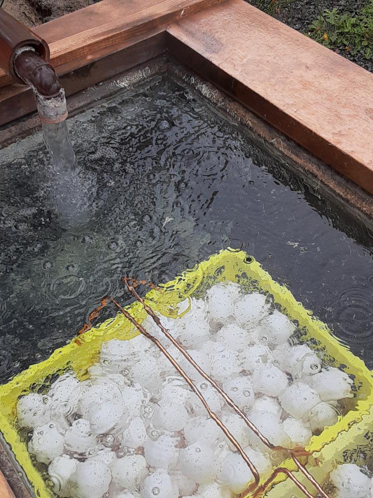 小野上温泉の源泉に 生たまごを つけて半熟にした 温玉たまごのことを ラジウム玉子といいます。