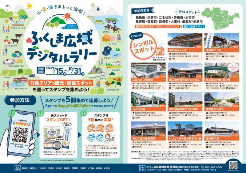 「ふくしま田園観光圏」構成市町村と近隣市の交流人口の拡大と地域経済の活性化を目的とした、道の駅や観光スポットをめぐるデジタルスタンプラリーが開催中です。対象エリアの観光・飲食スポットを巡ってスタンプを集め、豪華賞品をGETしよう! 【開催期間】2023年7月15日(土)〜10月31日(火) 【参加方法】@LINEから参加登録!LINE公式アカウントから友だち追加A各スポットでスタンプGET!(のぼりが目印!)※対象スポットに掲示されているポスターのQRコードを読み込むとスタンプ1個GETできます。Bスタンプを5個集めて応募!※スタンプ5個のうち3個以上シンボルスポットでスタンプを取得することが応募の条件となります。※開催期間中、何度でも応募できますが、1応募期間ごとに当選はお1人様1回です。 【賞 品】A賞・各市町村の宿泊券、食事券など 15,000円分・・・44名様B賞・各市町村の特産品詰め合わせ 6,000円分・・・・121名様C賞・各市町村の特産品詰め合わせ 3,000円分・・・・121名様コンプリート賞(シンボルスポット11箇所全てでスタンプを獲得)・2万円相当の賞品・・・11名様 【応募期間】抽選は期間中、4回行います。1回目:7/15(土)〜7/31(月)2回目:8/1(火)〜 8/31(木)3回目:9/1(金)〜 9/30(土)4回目:10/1(日)〜10/31(火) 【参加市町村】山形県米沢市・福島県/福島市・相馬市・二本松市・伊達市・本宮市・桑折町・国見町・川俣町・大玉村・飯館村 【対象スポット】米沢市:道の駅米沢(シンボルスポット)・道の駅田沢 なごみの郷・鷹山堂 COFFEE&SOUVENIR・笹野民芸館・中山果樹園 よってってカフェ・和庭 福島市:道の駅ふくしま(シンボルスポット)・道の駅つちゆ・こむこむ館・UFO物産館・旧堀切邸・浄楽園相馬市:道の駅そうま(シンボルスポット)・相馬復興市民市場 浜の駅松川浦・千客万来館・伝承鎮魂祈念館・尾浜こども公園二本松市:にほんまつ城報館(シンボルスポット)・道の駅安達・道の駅ふくしま東和・道の駅さくらの郷・安達ケ原ふるさと村・岳温泉観光協会伊達市:道の駅伊達の郷りょうぜん(シンボルスポット)・まちの駅やながわ・みらい百彩館んめ〜べ・農産物直売所こらんしょ市場・コスモス直売所・つきだて交流館もりもり本宮市:花と歴史の郷 蛇の鼻(シンボルスポット)・アサヒビール園福島本宮店・菓子処いづみや・プリンス ウィリアムズ パーク英国庭園・みずいろ公園・フレッシュベーカリームラヤマ桑折町:うぶかの郷(シンボルスポット)・Legare Koori・旧伊達郡役所・桑折西山城跡・半田山自然公園国見町:道の駅国見あつかしの郷(シンボルスポット)Co-working&Co-learninng Spaceアカリ・ガラスエッチングアートHIKARI・Gela319・あつかし千年公園川俣町:道の駅かわまた(シンボルスポット)・とんやの郷・羽山の森美術館・川俣中央公園・おじまふるさと交流館・峠の森自然公園大玉村:あだたらの里直売所(シンボルスポット)・大玉カレー大玉温泉金泉閣・お米工房ままや・アットホームおおたま・シャムロック・森の民話茶屋飯館村:いいだて村の道の駅までい館(シンボルスポット)・宿泊体験館きこり・いいたてスポーツ公園・はやま湖 ※詳しくは特設サイトをご覧ください。 【お問い合わせ】ふくしま田園観光圏事務局(福島市観光交流推進室)TEL:024-525-3722(平日9:00〜17:00 土日祝は除く)
