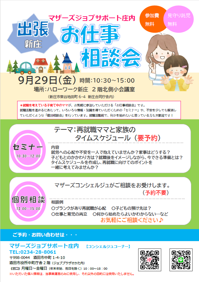 マザーズジョブサポート庄内おしごと相談会in新庄を開催します。 【開催日】9月29日(金)【開催場所】ハローワーク新庄 2階北側小会議室【内容】◎10:30〜12:00 セミナー 「再就職ママと家族の タイムスケジュール」 ※お申込みが必要です。 就職への心配や不安を一人で抱えていませんか? 家事はどうする? 子どもとのかかわり方は? 就職後をイメージしながら、今できる準備とは? など、一緒に考えてみませんか? ◎13:00〜15:00 個別相談会 ※どなたでもご利用いただけます お申込みは不要です。 ・おしごとに関するお悩み ・子育てに関すること ・仕事と家事、子育てとの両立 など、お気軽にご相談ください。 ♪お子さんと一緒に、お気軽にお越しください♪お子さんと同じお部屋でセミナーを受講し、相談することができます。保育スタッフが、ママをサポートします。 ★★利用者の方へお願い★★場合によっては、体調の確認をさせていただくことがございます。状況によっては、ご案内の変更をさせていただきます。あらかじめご了承ください。★★ーーーーーーーーーーーー★★どうぞ、お気軽にお問い合わせくださいね。 ◇お申込み・お問い合わせ◇マザーズジョブサポート庄内TEL:0234-28-8061メールでのお申込みはコチラ