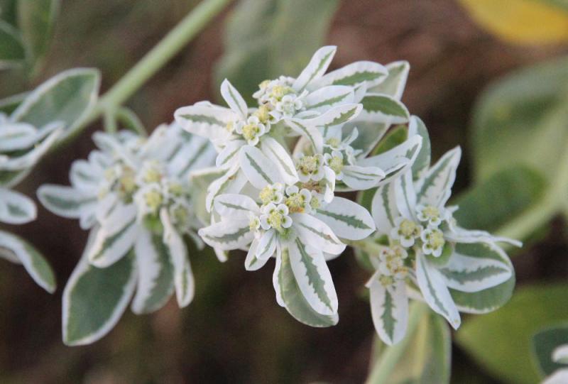 ●散歩の途中で「ハツユキソウ」でしょうか真っ白な花を咲かせています 「ハツユキソウ」と聞くと冬の植物かと思うかもしれませんが 真夏の今葉のふちが白くなって 雪が降ったかのように見える草花です 花よりも葉の美しさを楽しむ草花です 真夏の暑さや直射日光にも負けない強い植物で毎日暑い日が続く中でも爽やかな白い色で庭を彩っています