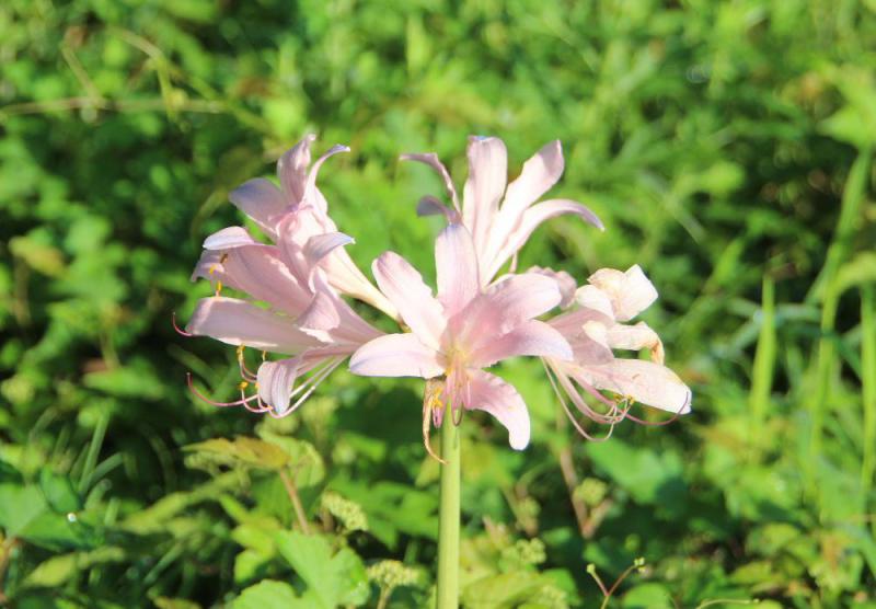 ●きれいなピンク色の花 太い茎 ヒガンバナに似た「ナツズイセン」が国道駐車帯土手に咲いているのを見つけました 花のあとに出てくる葉っぱの形が水仙に似ていることから「ナツズイセン」と名付けられといわれています 彼岸花科でヒガンバナより1か月ほど早い8月に咲くのだそうです ぽつんと1輪咲いているのでもしかすると停まっている車から捨てられたものが根付いて育ったのでしょうか それとも自生したものでしょうか