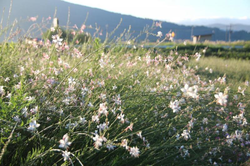 ●伸びた茎の先に蝶に似た白い花をたくさんつけた「ハクチョウソウ」が咲いていました 大きな株に一面に蝶が舞うように咲いているので「ハクチョウソウ(白蝶草)」という和名がついたのだそうです 一つひとつの花は短命のようですが夏から秋にかけて次々と咲かせてくれますので長い期間鑑賞することができるようです 暑さにも寒さに強い花だそうですので育てやすい植物です
