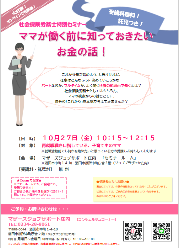 ☆ママが働く前に知っておきたいお金の話!☆ 「自分にはどんな働き方があっているのかな?」「よく聞く"扶養の範囲内で"働くって…?」プロとしてはもちろんママの視点からも語る社会保険労務士の話とともに自分の『これから』について考えてみませんか? 【日時】10月27日(金)10:15〜12:15【対象】就職を目指している子育て中のママ※就職活動前で何かを始めたい方でもOK 【会場】マザーズジョブサポート庄内 セミナールーム        (酒田市中町1-4-10 酒田市役所中町庁舎2階)       またはご自宅でオンライン受講(Zoom) 【料金】受講料 及び 託児料 無料 【託児】 ※事前登録・予約が必要です   保育ルーム開室日【水・木・金】の10:00〜16:00に登録にお越し下さい。 ※併設の保育ルームで、保育スタッフが お子さんをお預かりします。 ママは安心して受講いただけます。 ★★受講者の皆様へお願い★★場合によっては、体調の確認をさせていただくことがございます。状況によっては、ご案内の変更をさせていただきます。あらかじめご了承ください。★★ーーーーーーーーーーーー★★【駐車場について】   お車でお越しの際は、中町庁舎脇にある   セントラルホテル契約駐車場をご利用ください。(『ジョブプラザさかた』と表示してあります。)      ※契約駐車場が満車の場合は、 酒田市中央地下駐車場をご利用ください。 地下駐車場をご利用の方は、   無料駐車券(最大2時間)を発行いたします。   お帰りの際にコンシェルジュ窓口へお声がけください。どうぞ、お気軽にお問い合わせくださいね。◇お申込み・お問い合わせ◇マザーズジョブサポート庄内TEL:0234-28-8061メールでのお申込みはコチラ