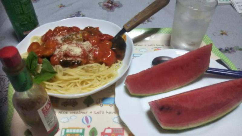 昨日お休み、早朝5時半から草むしり、菜園仕事の後は、エアコンきいた部屋でギター練習、そしてお昼、カンカン照りの中、我が家庭菜園トマトになす採って、トマト&ナスたっぷりナポリタンと自宅菜園スイカでランチ・・スイカは小玉スイカ3苗分はすでに片付け終了ですが、遅れて植えた苗2本分のスイカに4個ほど実がついている・・雨もなく大きくなっていかない、このまま腐れてしまうか?メロンも6個ほど小さいながら実がついている・・