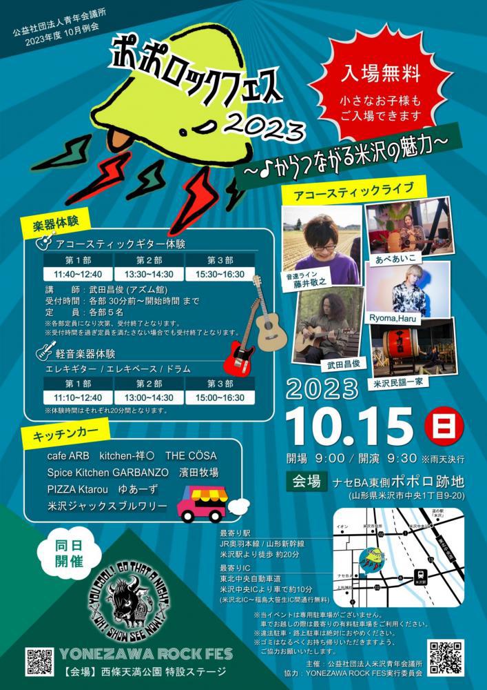 「ポポロックフェス2023〜♪からつながる米沢の魅力〜」が10月15日(日)に開催されます!アコースティックライブ、楽器体験、キッチンカーなどイベント盛りだくさんです!入場無料!小さなお子様も大歓迎!皆様のお越しをお待ちしています! 【開催日時】2023年10月15日(日)※入場無料・雨天決行 開場9:00/開演9:30 【会 場】ナセBA東側 ポポロ跡地 (山形県米沢市中央1丁目9-20)※当イベントは専用駐車場がございません。車でお越しの際は最寄りの有料駐車場をご利用ください。 【アコースティックライブ】出演者:音速ライン 藤井敬之・あべあいこ・武田昌俊・Ryoma,Haru・米沢民謡一家 【楽器体験】・アコースティックギター体験・軽音楽器体験 【キッチンカー】・cafeARB・kitchen-祥〇・THE COSA・Spice Kitchen GARBANZO・濱田牧場・PIZZA Ktarou・ゆあーず・米沢ジャックスブルワリー ※同日開催:YONEZAWA ROCK FES(会場:西條天満公園特設ステージ) ※詳細はこちらをご覧ください。 【お問い合わせ】公益社団法人 米沢青年会議所 TEL:0238-29-0336(月・水・金)