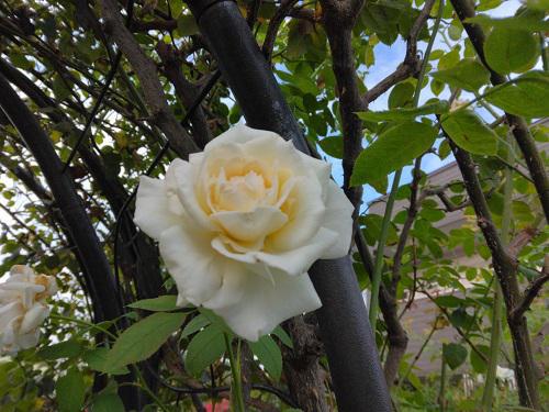 昨日夕方は、長井に「大雨警報」が・・・急にどしゃぶりの雨!雷も近くに落ちたのか凄かった、、、寝ていた老犬サスケもさすがにびっくりして起きた!  じーじの作業も、グットタイミング〜!雨降る前に終了、恵みの雨となりました。  ↓前日から”アスチルベ”のエリアの宿根草を掘り起こして花壇の土や腐葉土などを入れたりしての土壌改良を始めました。新たに土を40リットル2袋入れるも、全然増えた感じがしません。どこに消えたのか・・・   隣でばーばは、じーじと話しながらパチリ! ↓隣にあるブルーベリーの木は日照りで成熟まで至らず今年は収穫出来ず!(じーじのつぶやき)  ↓いつもは、きれいにドライ化する”カシワバアジサイ”ですが、雨不足で悲惨な状態!でも、見ようによってはブドウに見えないこともないよね。  ↓こちらの“アオキ”はもう葉が黒く焼けて枯れています!今までこんな状態になったことはなかったのに・・・ ↓暑さで大変な状態の中で、こんなに爽やかに〜こんなに元気に咲いてくれる子もいてチョットほっこりしてしまいました。  おまけのバラは。。。 (トップ写真)は。。。“ブランピエールドゥロンサール”一番キレイな時に撮れました♪(見つけた時は感激〜〜) ↓こちらも久しぶりの登場〜