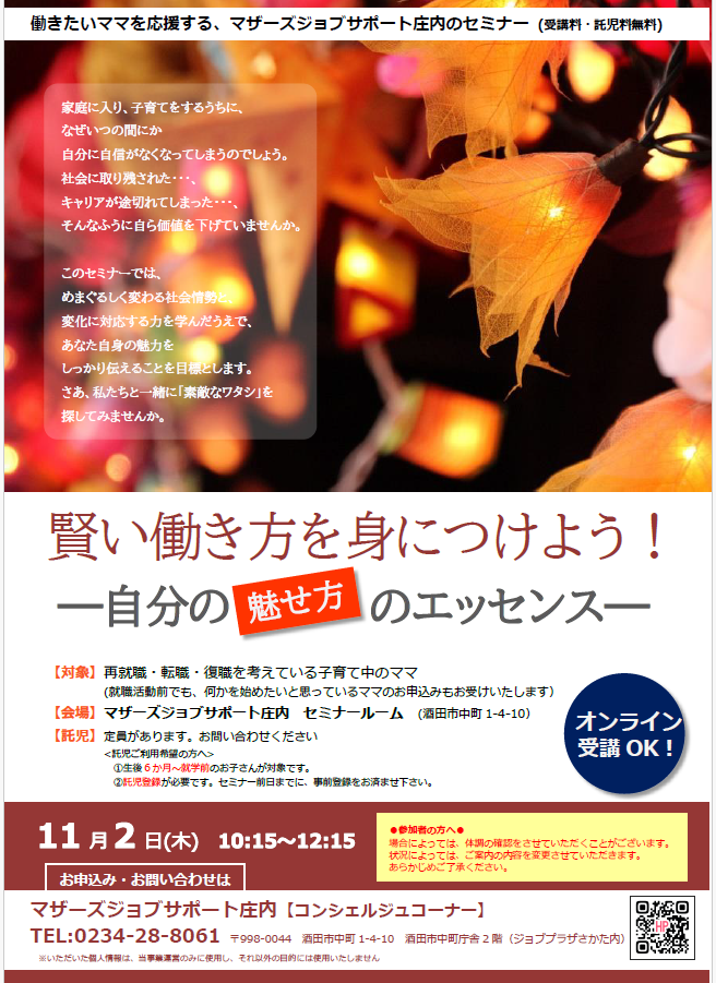 『賢い働き方を身につけよう!』〜自分の魅せ方のエッセンス〜開催のお知らせです。Zoomでも配信します! めまぐるしく変わる社会情勢と変化に対する力を学んだうえで、あなた自身の魅力をしっかりと伝えることを目標とします。さあ、私たちと一緒に「素敵なワタシ」を探してみませんか?【日  時】11月2日(木)10時15分〜12時15分     【対  象】就職を目指している子育て中のママ※就職活動前でも何かを始めたいと 思っているママもOK 【会  場】 マザーズジョブサポート庄内  セミナールーム または ご自宅でオンライン受講(Zoom)【受講料・託児料】 無料【託児】  ※事前登録・予約が必要です 保育ルーム開室日【水・木・金】の 10:00〜16:00に登録にお越し下さい。※併設の保育ルームで、保育スタッフが お子さんをお預かりします。 ママは安心して受講いただけます。★★セミナールームご利用の皆様へお願い★★場合によっては、体調の確認をさせていただくことがございます。状況によっては、ご案内の変更をさせていただきます。あらかじめご了承ください。★−−−−−−−−−−−−−−−−−−−★ ●ご自宅でオンライン受講ご利用の方へ●・インターネット環境が必要になります。 通信料は自己負担です。・パソコン、スマートフォン、 またはたタブレットをご準備いただき、 事前にZoom meetingを ダウンロードしてください。・セミナー中はカメラをオンにし、 お顔の見える状態で受講して下さい。 【駐車場について】お車でお越しの際は、中町庁舎脇にある〈セントラルホテル契約駐車場〉をご利用ください。(ジョブプラザさかたと表示してあります。)※契約駐車場が満車の場合は、酒田市中央地下駐車場をご利用ください。無料駐車券(最大2時間)を発行いたします。お帰りの際に、コンシェルジュ窓口へお声がけください。 ◇お申込み・お問い合わせ◇マザーズジョブサポート庄内TEL:0234-28-8061メールでのお申込みはコチラ