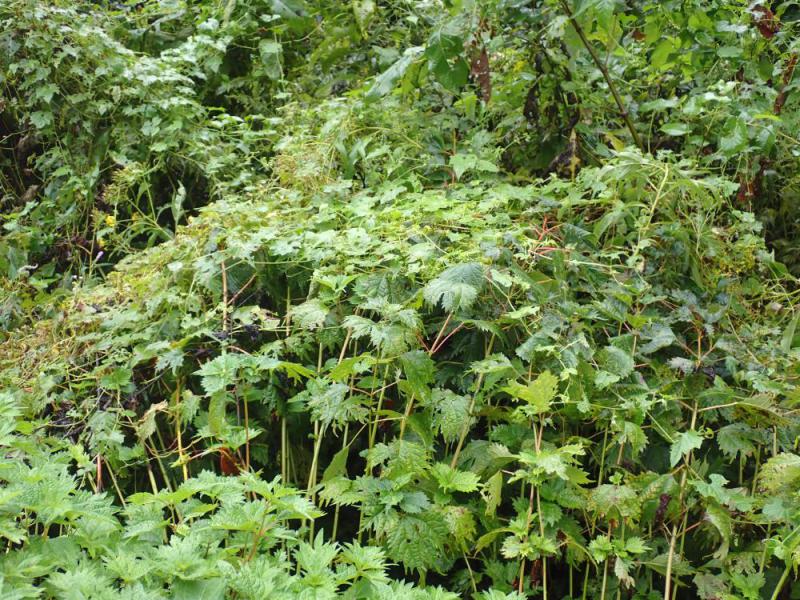 温室形成の初期 1.科差を作る:両性花会か~短柄作る~葉腋~ 此れからの写真はそれぞれに温室形成に関連する。何と言っても最初は発芽=実生,そして薫製である。写真上部がミヤマニガウリで、下部はイラクサや低木で巻きズルの絡みあっての成育を示している。