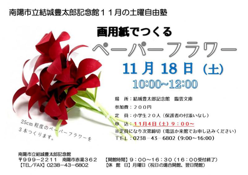 土曜自由塾は、6月〜12月の第4土曜日(変更あり)に行う小学生を対象とした講座です。つくるものは決まっていますが、その中で自分の好きなようにのびのびと楽しくつくります。11月の土曜自由塾は、画用紙でつくるペーパーフラワーです。申 込:11月4日(土)9:00〜※定員(小学生20人)になり次第締切電話か来館でお申し込みください。TEL:0238−43−6802(9:00〜16:00) 10月21日(土)に行った「ハロウィン帽子をつくろう」無事に終了しました。ありがとうございます。土台の帽子作りを終えた後は、みんな自由に自分だけの飾りつけを楽しみ、あっという間に時間が過ぎました。自分のセンスが光った帽子になったのではないでしょうか。被ったり飾ったりしてくださいね。