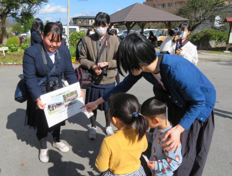 10月22日の長井線祭り。今年は全線開通100周年を記念して、5駅クイズラリーが行われました。来場者にクイズに答えてもらい、正解すると特製缶バッチがプレゼントされるものです。羽前成田駅では長井高校写真部の生徒さんが交代で手伝ってくれました。そんな姿をご覧になっていた方がブログの中で、次のような感想を書かれていたので紹介します。 /////////////// 昼前には青空が広がり、羽前成田の駅前には「いも煮」を求める人の行列もできた。駅舎内では、長井高校写真部の皆さんによる写真展も開かれ、高校生の皆さんもイベントを手伝う姿も見られた。 ひととき、大いに賑わう羽前成田駅。地域の方々がこうして鉄道を守る姿に、フラワー長井線の魅力の本質がある。 → フラワー長井線まつりの日 - カマ鉄オモシー組合 (goo.ne.jp)