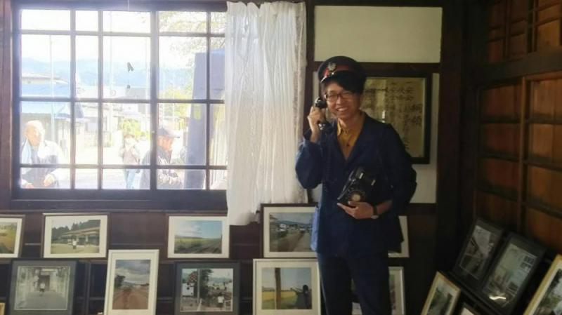 芋煮会の会場設営後に駅茶を覗いてみると、米屋先生が機関士の制服を着て、国鉄時代の駅長帽をかぶり、ダイヤル式の黒電話を持って立っているではないか。満面の笑みは、まるでオモチャを買ってもらってご満悦の子供のよう。  「米屋先生、何をやられているのですか?」と聞こうと思ったその時、手前にいて米屋先生にカメラを向けている生徒達に、「逆光だから暗くならないようにね」とか「もっと人に近づいて行かないと」などと実技指導をしていたのでした。  モデルになった米屋先生の表情を見ていて、以前、高校生に指導してくれた方の言葉が思い出されました。その方は全員での記念撮影の際に「あなた達が自然な笑顔で映るようになることも大切なことだよ。」と話していました。さてさて、生徒たちは、米屋先生の熱血授業から何をつかんだのだろうか。  【おらだの会】高校生と作家さんの初めての出会いは、6年前のこと。  → 作家さんとお話しを:山形鉄道 おらだの会 (samidare.jp)       米屋先生のことはこちらからどうぞ  → 米屋こうじさんのこと その1(木造駅舎から):おらだの会 (samidare.jp)  → 米屋こうじさんのこと その2(想いのしずく):おらだの会 (samidare.jp)
