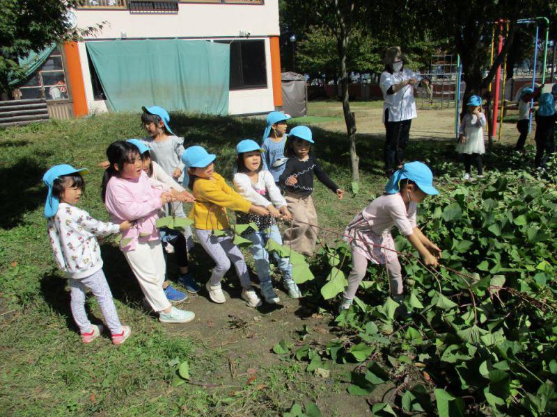 保育園の畑で秋の野菜を収穫しました。「秋」ならではのさつまいもと里芋掘りをワイワイ楽しく行い「おっきいのみつけたー」と嬉しそうに見せてくれました。10/26青空の下園庭で芋煮会をしました。楽しみにしていた子どもたちが朝から食材をちぎって下準備をしたり、あそんでいるとお醤油のいい香りに気付いて「いいにおいする」「おなかすいた」と集まり鍋を囲んで見ていました。幼児組さんは園庭にシートを敷いてみんなで美味しくいただきました。