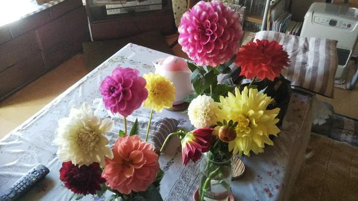 昨日11月3日川西ダリヤ園のダリア摘み行ってきた、開園最終日に行われる毎年恒例のイベント。駐車場も満杯で、園内も人が多かったです。最終日は見学は無料で、摘み取りする場合は500円で、園内に咲く好きなダリアを摘み取り持ち帰ることができます。袋と鋏が渡されますから手ぶらでOK,10本以上の収穫を希望される場合は、10本ごとに参加料を渡して再入場することになるのですが、我が家のテーブルに飾りましたけど・・10本で十分ですね、二つに花瓶分けました・・・家に花いいものです