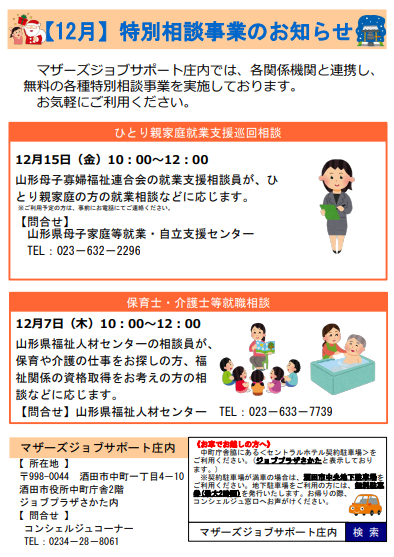 マザーズジョブサポート庄内では、各関係機関と連携し、各種特別相談事業を実施しております。ぜひ、ご利用ください。 保育士・介護士等就職相談 ※お申し込み不要日 時 12月7日(木)10:00〜12:00場 所 マザーズジョブサポート庄内 セミナールーム問合せ 山形県福祉人材センター пF023-633-7739HP:http://www.ymgt-shakyo.or.jp/jinzai/保育士・介護士・看護師など資格をお持ちの方や、資格取得を目指している方、福祉職にご関心のある方は、お気軽にお越しください。 ひとり親家庭就業支援相談 [要予約]日 時 12月15日(金)10:00〜12:00場 所 マザーズジョブサポート庄内 セミナールーム問合せ 山形県母子家庭等就業・自立支援センター пF023-632-2296HP:http://www.y-boshi.com/self-support/ひとり親家庭の方や今後について考えている方、どうぞお気軽にご相談ください。 ※各相談会について、利用ご希望の方は、マザーズジョブサポート庄内までお気軽にお声掛けください。※ご相談の際、お子さまの託児は『保育ルーム きらきら』をご利用いただけます。託児ルームのご利用には、事前のご登録が必要です。 【駐車場について】お車でお越しの際は、中町庁舎脇にあるセントラルホテル契約駐車場をご利用ください。(ジョブプラザさかたと表示してあります。)※契約駐車場が満車の場合は、酒田市中央地下駐車場をご利用ください。無料駐車券(最大2時間)を発行いたします。お帰りの際に、コンシェルジュ窓口へお声がけください。 ◇お申込み・お問い合わせ◇マザーズジョブサポート庄内TEL:0234-28-8061メールでのお申込みはコチラ